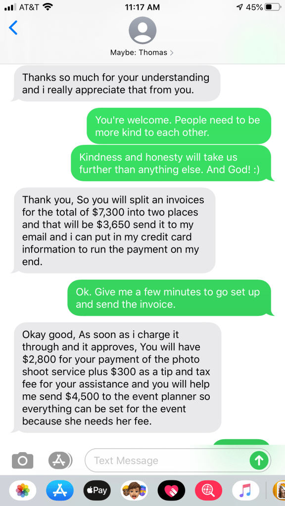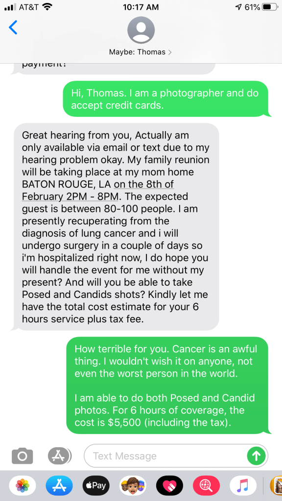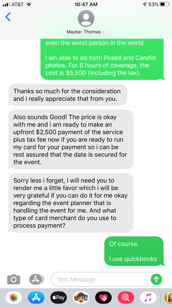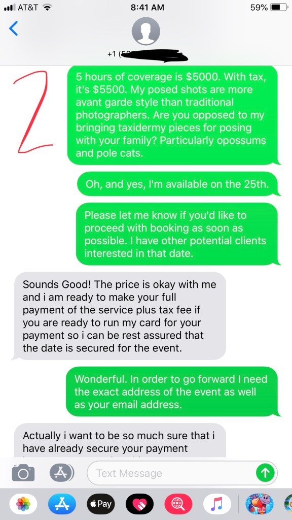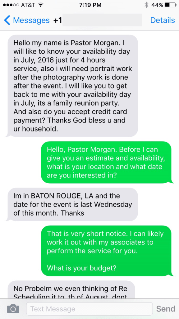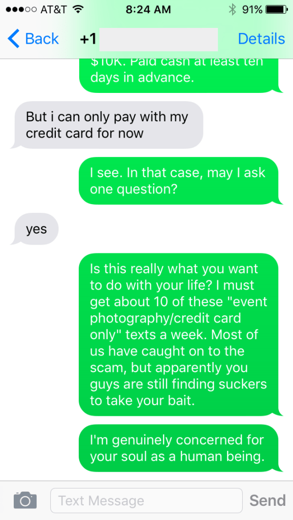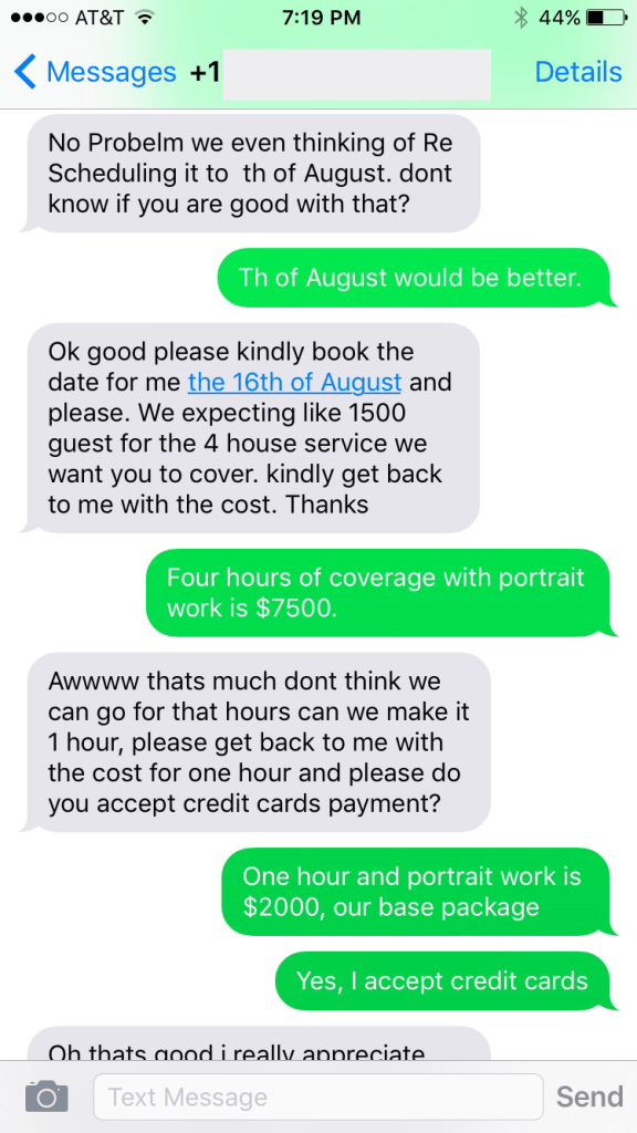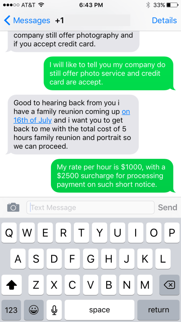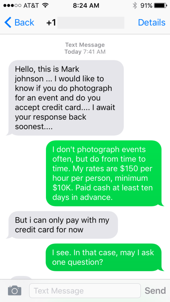 One of my absolute favorite pastimes is trolling photography credit card scammers. For those of you who don’t know, photographers and other small business owners/vendors get approached by scammers who request an event be photographed. Seems legit until they insist on paying with a credit card AND let you know that you can “do them a favor” by paying the event planner – who for whatever reason cannot accept credit card payments – on their behalf. This would mean charging a large amount and forwarding via check/cash the planner’s fee. You can read more about this type of scam on The LawTog’s site.
