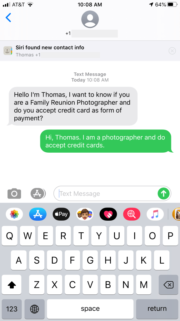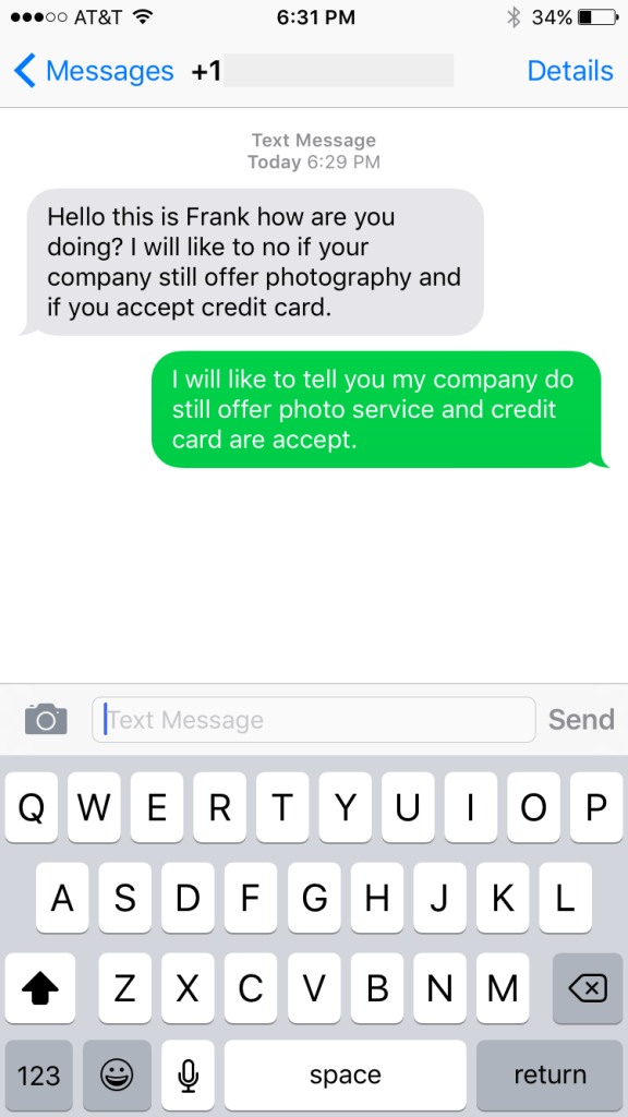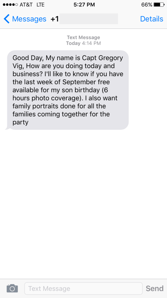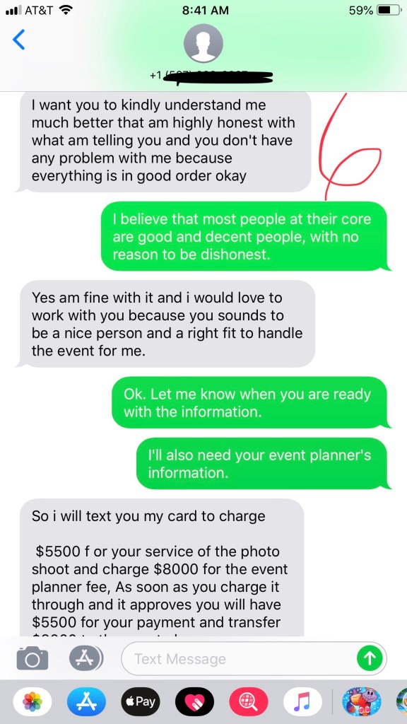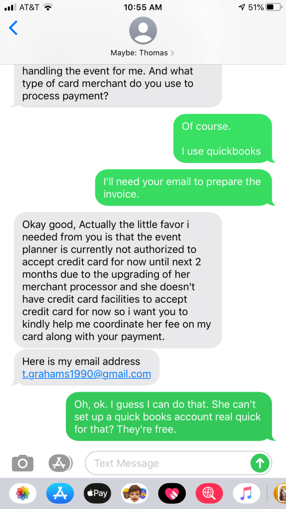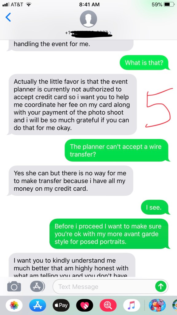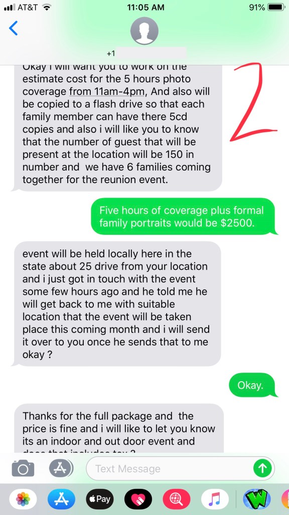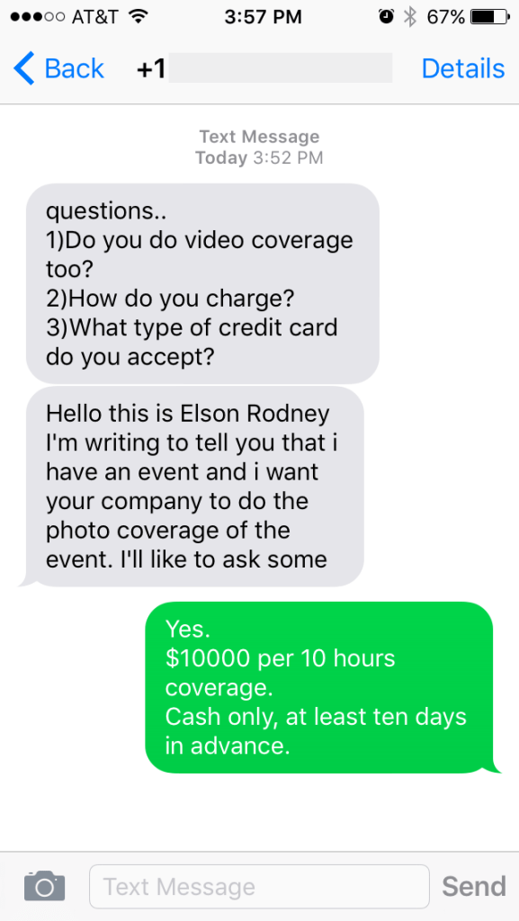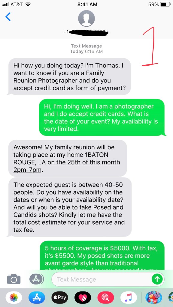 One of my absolute favorite pastimes is trolling photography credit card scammers. For those of you who don’t know, photographers and other small business owners/vendors get approached by scammers who request an event be photographed. Seems legit until they insist on paying with a credit card AND let you know that you can “do them a favor” by paying the event planner – who for whatever reason cannot accept credit card payments – on their behalf. This would mean charging a large amount and forwarding via check/cash the planner’s fee. You can read more about this type of scam on The LawTog’s site.