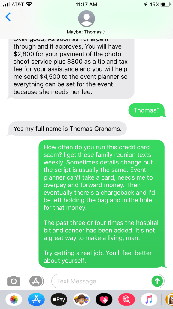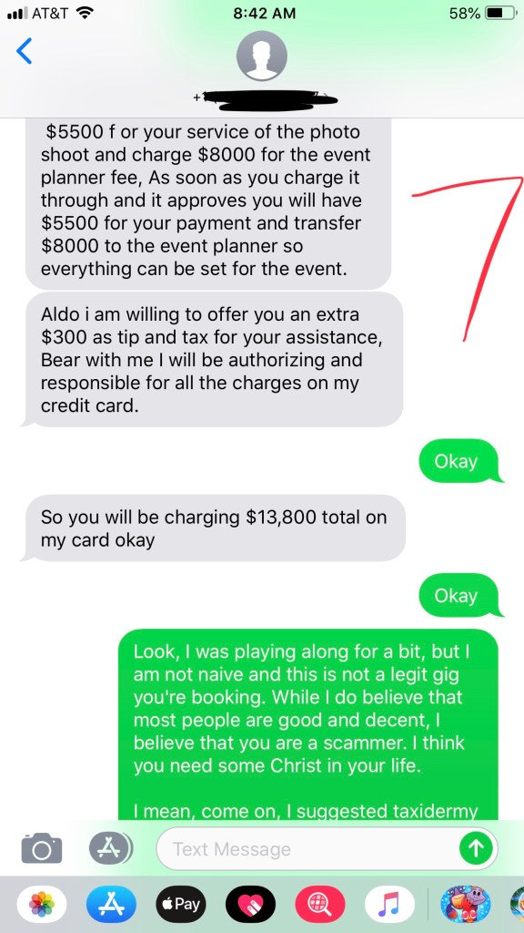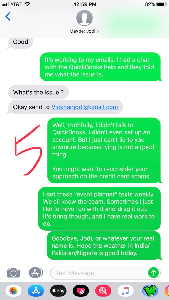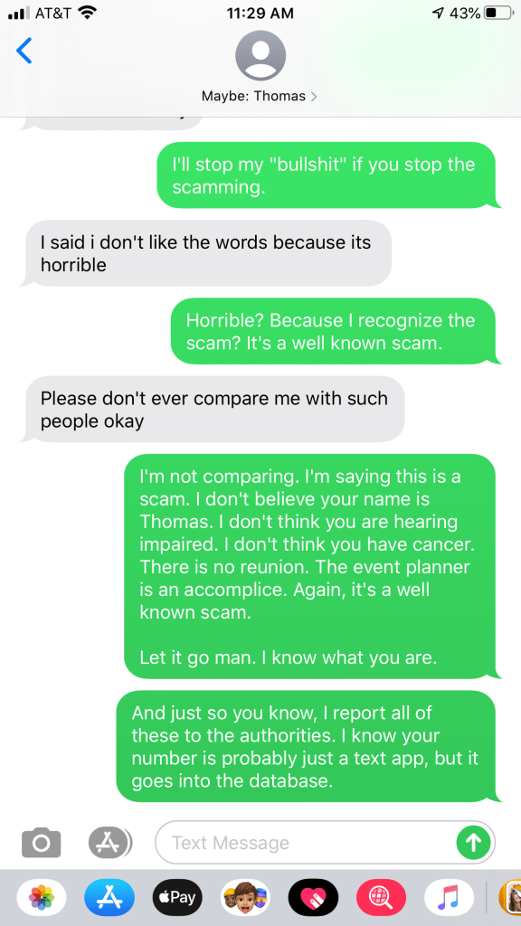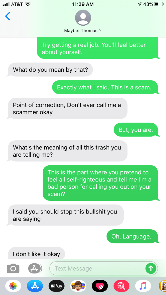 I get these sort of scam messages frequently. I don’t always reply; sometimes, I just block and delete. On occasion, though, when work is slower or I’m feeling particularly salty, I play. I wish I had screen shots of every exchange I’ve had like these, but I don’t always think to save them.