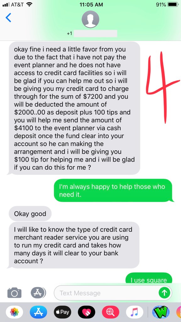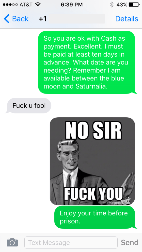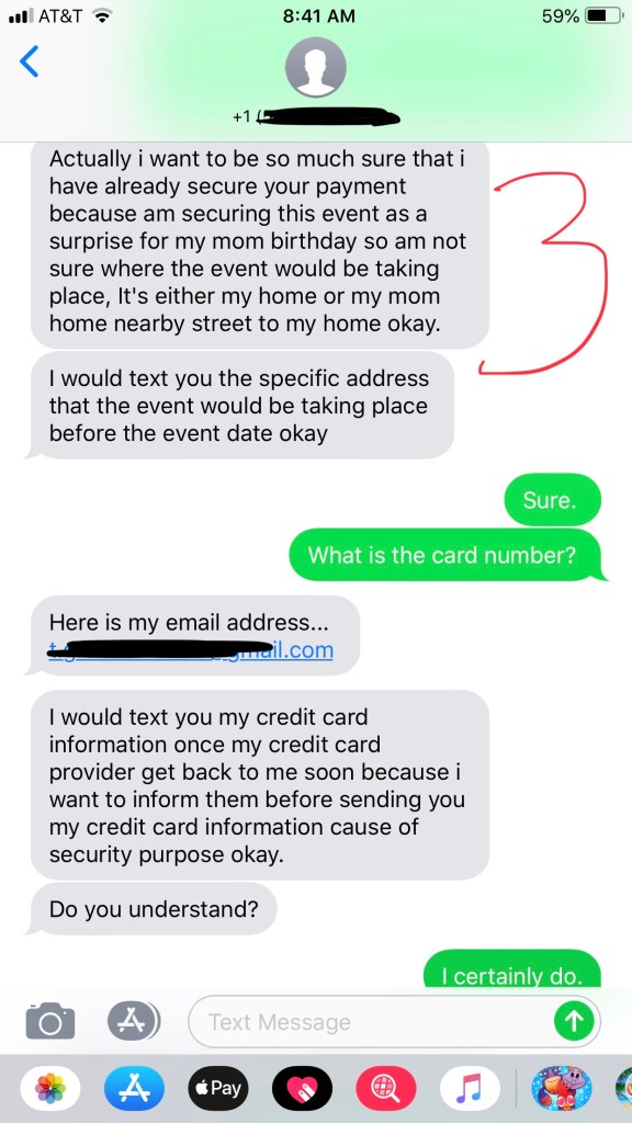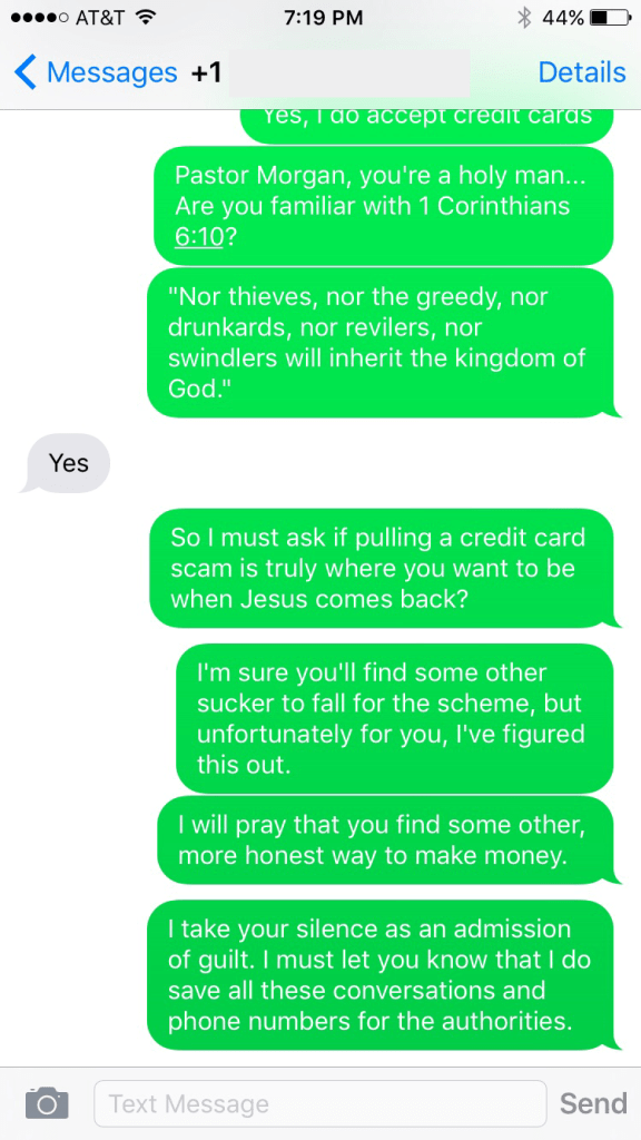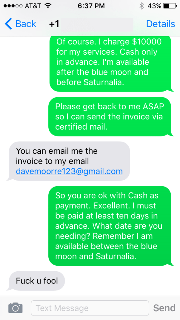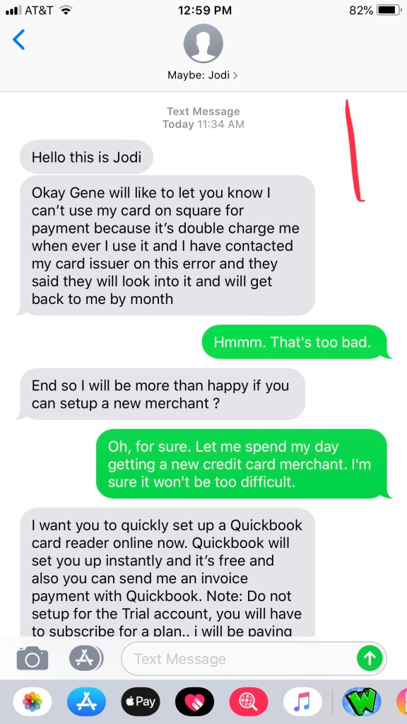 I get these sort of scam messages frequently. I don’t always reply; sometimes, I just block and delete. On occasion, though, when work is slower or I’m feeling particularly salty, I play. I wish I had screen shots of every exchange I’ve had like these, but I don’t always think to save them.