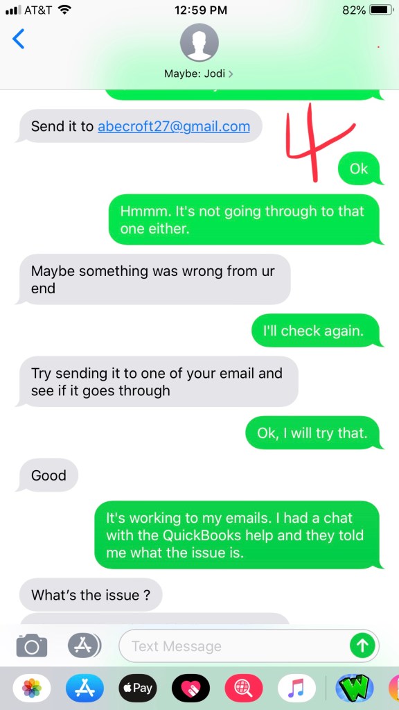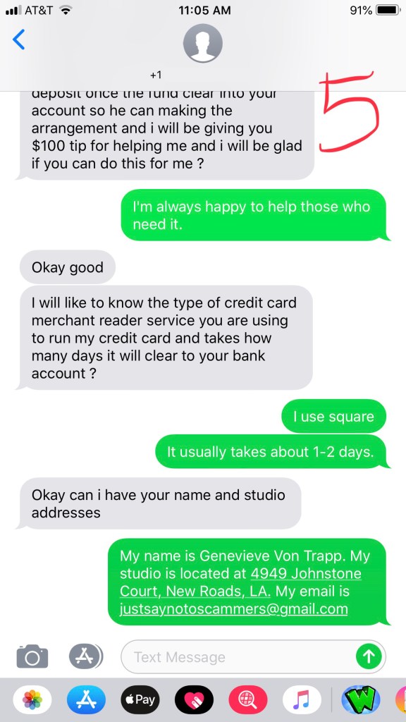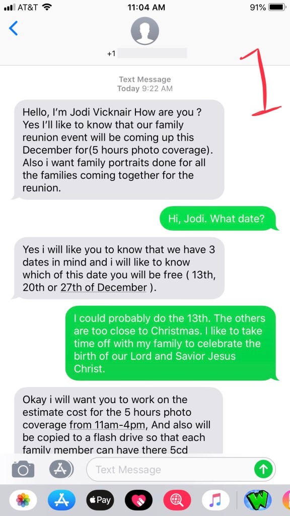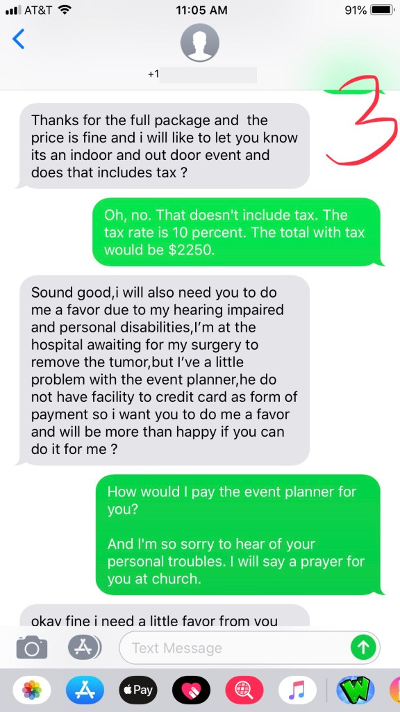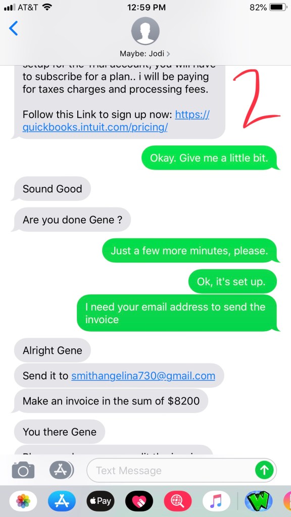 When I saw the chosen name of the scammer for this attempt, I laughed out loud in my house and the dog jumped up from a nap and shook. “Vicknair” is a very Louisiana name, so I knew this guy had done his research. Well, to a point. “Jodi” sent me texts from two different phone numbers, so the gallery is presented in two parts.