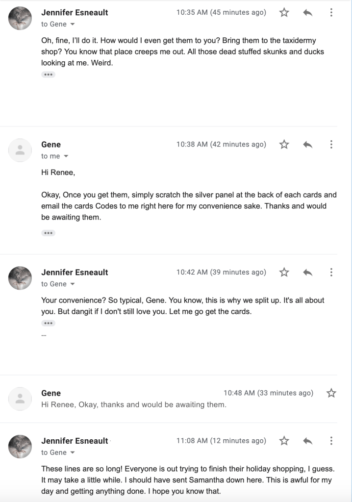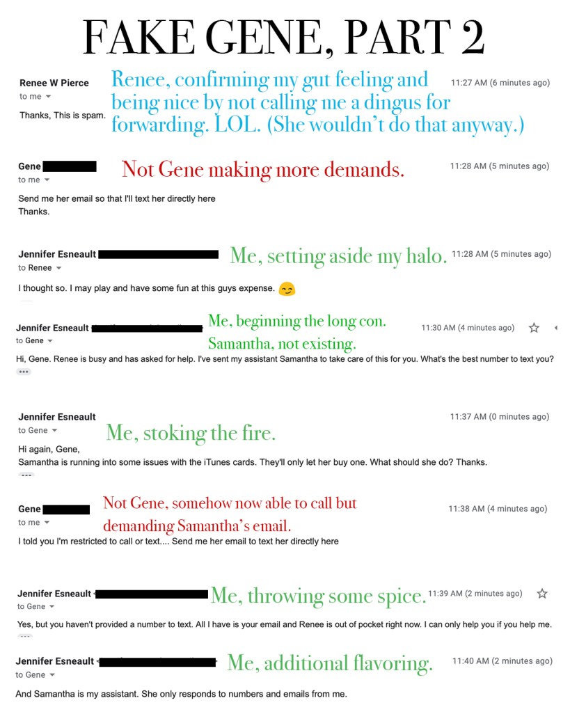 This was the first scam email I have received, so I was thrown for a loop for a minute. There is a real Gene. I blacked out the last name because the real Gene is a nice guy, and I won’t drag his family name. Fake Gene refers to me as “Renee” because the email address he messaged was formerly the email address of a real person I know named Renee. The real Renee obviously was not expecting a weird scam email like this, so I launched my counterattack on Fake Gene.
